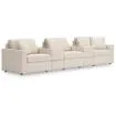 Includes 5 modular pieces: left-arm facing corner chair, armless chair, 2 consoles with storage and right-arm facing corner chair "Left-arm" and "right-arm" describe the position of the arm when you face the piece Modular pieces can float anywhere; sides are finished (with no connectors) Corner-blocked frame Loose reversible seat and back cushions; high-quality foam cushions wrapped in poly fiber Throw pillows included; soft polyfill Polyester upholstery Next-Gen Nuvella™ is a family-friendly fabric that is soft, easy to clean, stain-resistant and durable; easy-to-remove zippered covers for machine washing Clean fabric with mild soap and water, let air dry; for stubborn stains, use a solution of 4 oz. bleach to 28 oz. water Non-skid legs Console with removable plexiglass top; pull-out drawer for storage Platform foundation system resists sagging 3x better than spring system after 20,000 testing cycles by providing more even support Smooth platform foundation maintains tight, wrinkle-free look without dips or sags that can occur over time with sinuous spring foundations
