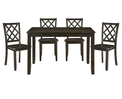 Conveniently packaged and styled for coordinated placement within your casual dining space is the Sunnyvale Collection. Offered in a charcoal or white finish over birch veneer, the dining collection features a table and four side chairs. The table’s transitional profile is complemented by the lattice-back chairs, their design a classic touch to the collection’s decorative versatility.
