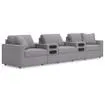 Includes 5 modular pieces: left-arm facing corner chair, armless chair, 2 audio consoles with storage and right-arm facing corner chair "Left-arm" and "right-arm" describe the position of the arm when you face the piece Modular pieces can float anywhere; sides are finished (with no connectors) Corner-blocked frame; reversible seat and back cushions; high-quality foam cushions wrapped in poly fiber Throw pillows included; soft polyfill Polyester upholstery Next-Gen Nuvella™ is a family-friendly fabric that is soft, easy to clean, stain-resistant and durable Easy-to-remove zippered covers for machine washing Clean fabric with mild soap and water, let air dry; for stubborn stains, use a solution of 4 oz. bleach to 28 oz. water Non-skid legs Console with removable plexiglass top; pull-out drawer for storage; built-in audio sound system with wireless connectivity; audio controls located on console; USB charging; power cord included, UL Listed Platform foundation system resists sagging 3x better than spring system after 20,000 testing cycles by providing more even support Smooth platform foundation maintains tight, wrinkle-free look without dips or sags that can occur over time with sinuous spring foundations