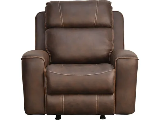 The Telluride rocker manual recliner has contrast stitching, contrast piped edges and is featured in a brown-colored fabric.
