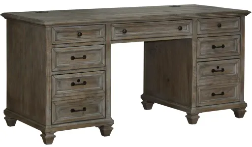 Our Kendall executive desk is a casual yet refined addition to your home office setup. Brushed pewter knobs and a dovetail grey finish up the rustic appeal while five drawers and a variety of practical features like wire management and a removable mouse and pencil tray create a functional, clutter-free workspace.