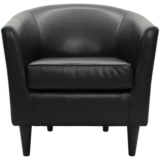 The Windsor accent chair is the perfect solution for smaller spaces. Covered in sleek, leather-look polyurethane, this barrel chair provides comfortable seating that fits right in with your contemporary or transitional living room, family room or den. This faux leather chair is sturdy yet remarkably lightweight, with a polystyrene frame that's even stronger than traditional wood. Tapered wood legs add a distinctive touch.