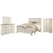 Includes queen panel bed (headboard, footboard and rails), 5-drawer chest and 6-drawer dresser with mirror Made of engineered wood (MDF/particleboard) and decorative laminate Whitewash replicated worn through paint; replicated wood grained block pattern Antiqued brass-tone hardware Dresser and chest with smooth-gliding drawers Mirror attaches to back of dresser Foundation/box spring required, sold separately; mattress available, sold separately Safety is a top priority, clothing storage units are designed to meet the most current standard for stability, ASTM F 2057 (ASTM International) Drawers extend out to accommodate maximum access to drawer interior while maintaining safety Assembly required