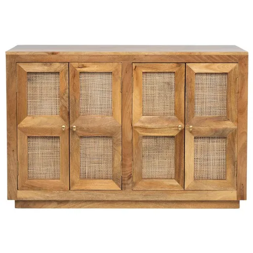 Make your space stand out with the Benares Small Sideboard. Made with wood and raffia, this beautiful buffet features a distressed pattern and coastal style. With four doors and two fixed shelves, it has plenty of space for storage. Made in India, this cabinet is just perfect for your decor.