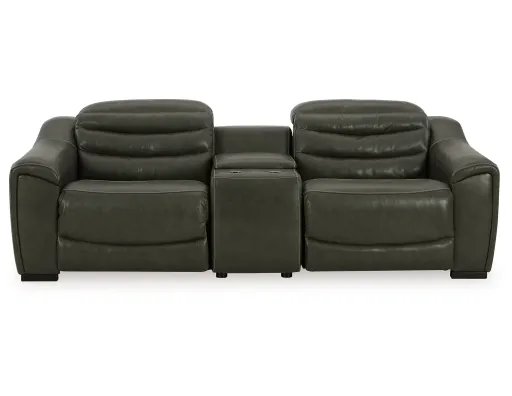 For those seeking to curate a living room retreat that offers superior comfort and a contemporary aesthetic, this sleekly designed power reclining loveseat with console will become your favorite source of at-home serenity. Rest on leather match upholstery, and use the one-touch power control to recline and adjust the headrests with ease. As you recharge after a long day, your devices can too with USB charging. This loveseat is visually enticing in a luxe dark gray, with slope track arms and stitched detailing on the back to enhance its modern appeal.