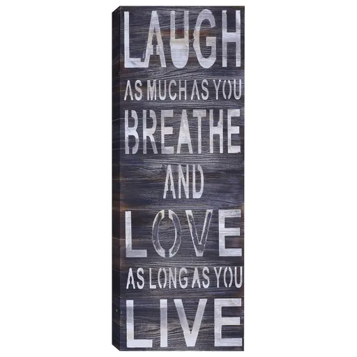 Laugh Breath Painting sign.Brown brushed finish with white lettering.Wood construction.15"w X 47"h x 2"d.All sizes are approximate.Available in stores only.