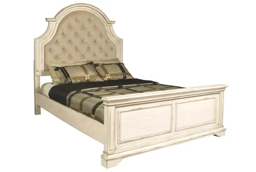 The Dorothy King Wood & Upholstered Panel Bed With USB combines classic elegance with modern functionality. This Eastern King bed features a beautiful beige fabric upholstery and a sturdy rubberwood construction. The vintage French country cottage charm is enhanced by a creamy off-white stain with brown and gray burnishing, making it a timeless addition to any bedroom.