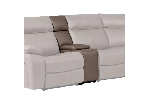 The Salvo Toffee Console with Power Center in Stokes Toffee offers a casual yet sophisticated seating solution. Crafted from a high-performance polyester blend, this console combines comfort and functionality with its contoured bucket-style seats, plush arms, and a bustle-back pillow headrest. The center seat features a power center, and the center-back doubles as a pull-down console table with cup holders, making it perfect for relaxation and convenience.