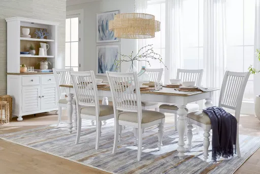 Our Nantucket dining table boasts classic charm and grandeur. With a white oak rectangle top that comes with one 18-inch leaf for easy entertaining and featuring a white and driftwood two-tone finish, this piece makes a bold statement. Designed for the ultimate entertainer, this table is inviting and ideal for get-togethers.
