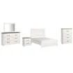Includes full panel bed (headboard, footboard and rails), 4-drawer chest, 6-drawer dresser with mirror and 2-drawer nightstand Made of engineered wood (MDF/particleboard) and decorative laminate White rustic finish with replicated cedar grain Dresser, nightstand and chest top with rustic gray planked replicated oak grain with authentic touch Dresser, nightstand and chest feature smooth-gliding drawers with faux linen lining; large scale dark colored handles Mirror attaches to back of dresser Foundation/box spring required; sold separately Mattress sold separately Safety is a top priority, clothing storage units are designed to meet the most current standard for stability, ASTM F 2057 (ASTM International) Drawers extend out to accommodate maximum access to drawer interior while maintaining safety Assembly required