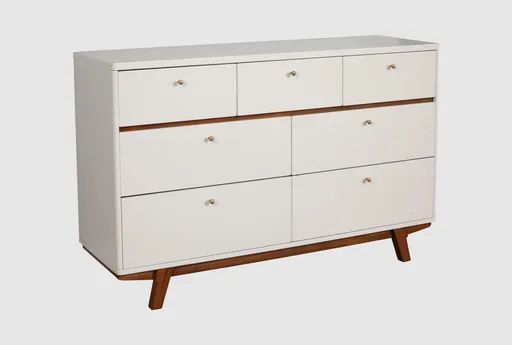 The Clearview White 7-Drawer Dresser is a stunning addition to any modern bedroom. Featuring a sleek white finish with acorn accents, this dresser combines contemporary design with mid-century modern flair. Crafted from plantation mahogany solids and okoume veneer, it offers both durability and style.