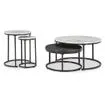 Includes coffee table, 2 end tables and ottoman Tabletop made with faux Carrara marble laminate and MDF substrate Tubular metal frame with dark powder coat finish Ottoman with black faux leather upholstery Nesting design