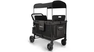 Elite Quad Wagon will be your best companion. This baby sits up to four kiddos and leaves ample space for all of your things: diaper bags, shopping bags, snacks, toys, etc. The W4 Elite comes with a removable rear basket that is perfect for holding all your essentials. For those days outside, we have an adjustable canopy that can be moved up and down and side to side based on your preference. Kids will love the front zippered entrance to crawl into the wagon. The all-terrain wheels, one-step foot brake and pull strap is perfect for those rough terrains for hikes or sandy beaches. This wagon also has a deep carriage with mesh sides to add some ventilation. Oh, and we love that roll out wind/privacy shade for ultimate protection. Your kids are gonna love the raised seats. They are removable and reclinable! With our 5-point harness, you can ensure a safe, secure ride for the kids. Trust us, your kids will be riding in style.