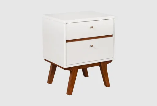 The Clearview White 2-Drawer Nightstand is a perfect blend of modern and mid-century modern styles, adding a touch of elegance to any bedroom. Crafted from plantation mahogany solids and okoume veneer, this nightstand features a sleek white finish with acorn accents, making it a versatile piece for various decor themes.