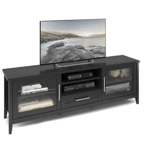 This elegant and transitional black extra wide 70 inch TV stand from RC Willey is part of the Jackson Collection by CorLiving. This timeless staple item is featured in a wood grain finish accented with imitation nickel handles, 2 glass doors and a center cabinet drawer. Offering a variety of open and concealed storage options this timeless TV stand is perfect for all of your media devices and accessories and can accommodate most TVs up to 80 inches. Easy to assemble so you'll be set up in no time. Available for Online Purchase Only. Assembly required. This product ships direct from the manufacturer, so RC Willey Delivery is not available.