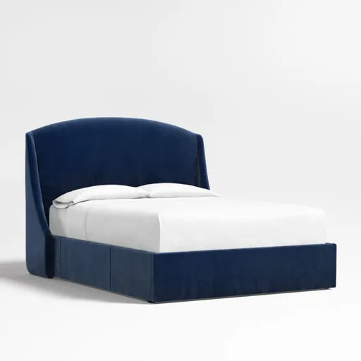 Our custom bed collection lets you mix and match our top-selling headboards and bases for a look that's truly yours. The Lafayette tall headboard gives your bed the sumptuous curves of a French-style chaise with a rounded top and sloped wings. The base integrates three roomy drawers—one on each side and one at the foot of the bed—for storing off-season clothes and extra blankets. As a plus, the side drawers open with just enough clearance to avoid hitting nightstands and other bedroom furniture. Both pieces are upholstered in navy blue faux mohair.