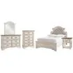 Includes bed (with upholstered headboard, footboard and rails), dresser with mirror and chest Made of veneer, wood and engineered wood, with cast resin components Bed with distressed, chipped white finish Polyester upholstery with foam cushion and button tufting Dresser, chest and nightstand with antiqued two-tone finish Dresser with 6 drawers (top drawers felt lined) Mirror attaches to back of dresser Chest with 5 drawers (top drawer felt lined) Nightstand with drawer and display shelf Drawers with dovetail construction Dark bronze-tone metal hardware Assembly required