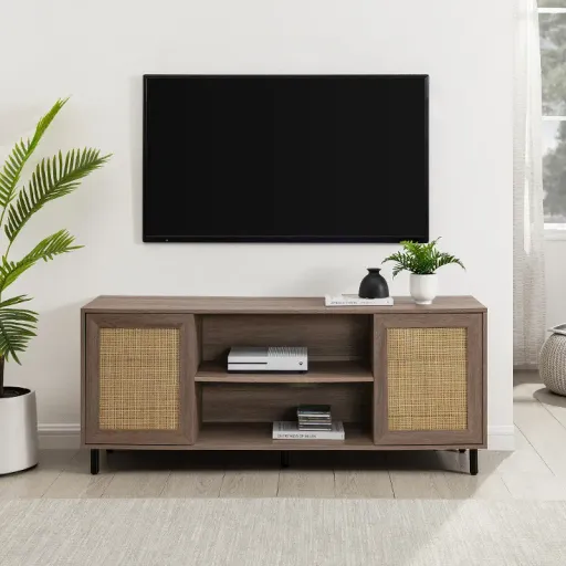 Reminiscent of a coastal retreat, this rattan-door TV stand will lend your home an instant style upgrade. The stunning cane doors can be easily clicked open or closed to reveal or conceal media and décor atop adjustable shelving. While its simple silhouette will be the eye-catching style icon that pulls any room together, the ample storage is the true hero. With enough space to house your record collection, streaming devices, and thrifted treasures, this gem gives major main character energy and basically does the decorating for you. Available for Online Purchase Only. Ships Directly from the Manufacturer. RC Willey Delivery is Not Available. Assembly required.