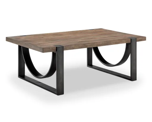 With echoes of equestrian inspired fashion, Brazen extends rustic hospitality with upscale appeal. Distressed iron has been artfully forged into a stirrup like 'U' shape and rests inside squared bases to uniquely support aged looking Rustic Honey wood tops on the rectangular end table, cocktail table and sofa table. Mirror image interlocking 'U's' create the exceptionally striking round accent table base to complete a great room with that perfect accessory piece.