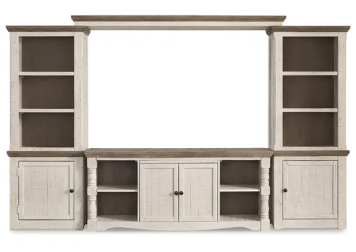 Set your sights on modern farmhouse style with the Havalance entertainment center. Distressed two-tone treatment blends a weathered gray with vintage white for an utterly charming effect. Turned posts lend a hearty, substantial look that feels right at home, while plenty of open shelving makes the aesthetic anything but heavy.