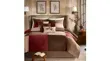 The Jackson Blocks queen 7-piece comforter set combines a casual look with pure comfort. The densely filled comforter and matching shams are made from pieced microsuede that comes together at each seam with pintucking details for added dimension. The large blocks of color bring warmth to the look of the set with deep red, taupe, chocolate brown and ivory colorways while the microsuede gives a soft comforting feel to the top of bed. A brushed fabric back provides a more matte look to the reverse of this cozy set. Three Decorative pillows in corresponding colors give small added details to this collection to give it a complete look.