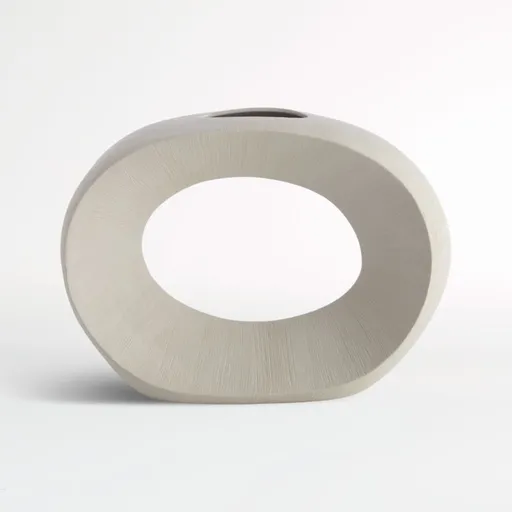 This dramatically different vase shapes a textured ring of cream-colored porcelain. Stunning on its own, the watertight vase has a small opening at the top to host a tropical leaf or single bloom. Pair with the other off-white vases in our exclusive Alura collection for sculptural impact.