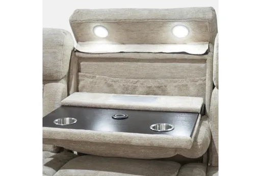 The Elisa Fawn White Armless Chair combines casual style with modern functionality. Upholstered in high-performance polyester fabric, this chair features a drop-down table with cup holders, a power center, a reading light, and a wireless charger, making it a versatile addition to any living space.