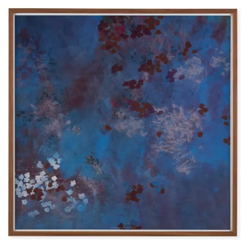Cedric Chauvelot is a French artist based in Brussels who makes prints inspired by his love of the countryside, Japan, and a range of arts from illustration and painting to ceramics and typography. This abstract floral print he created, titled Cerulean, is serigraphy printed in Belgium and framed in solid wood in Ohio.