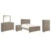 Includes full panel bed (headboard, footboard and rails), dresser, mirror, chest of drawers and nightstand Made of engineered wood (MDF/particleboard) and decorative laminate Warm vintage gray with subtle pearl effect over replicated cherry grain Dresser, chest and nightstand with pewter-tone hardware Dresser with 6 smooth-gliding drawers with replicated linen lining Mirror attaches to back of dresser Chest with 5 smooth-gliding drawers with replicated linen lining Nightstand with 2 smooth-gliding drawers with replicated linen lining Nightstand with 2 USB charging stations Power cord included; UL Listed Mattress and foundation/box spring available, sold separately Assembly required