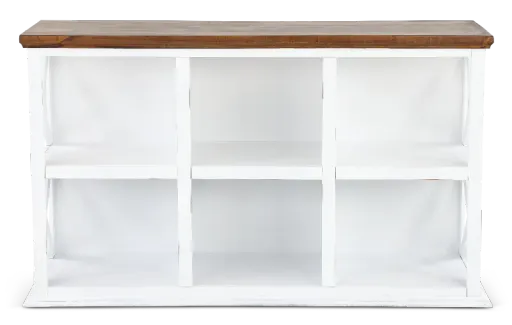This cozy, warm tv stand is finished in a distressed white with a natural wood tone tabletop. The classic farmhouse crossing details add style to the siding, while six open shelving cubes offer plenty of storage. Complete the look with your favorite TV up to 60 and you'll be ready for all those cozy movie nights at home!