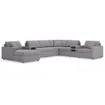 Includes 8 modular pieces: left-arm facing corner chaise, wedge, 3 armless chairs, 2 audio consoles with storage and right-arm facing corner chair "Left-arm" and "right-arm" describe the position of the arm when you face the piece Modular pieces can float anywhere; sides are finished (with no connectors) Corner-blocked frame; loose reversible seat and back cushions; high-quality foam cushions wrapped in poly fiber Throw pillows included; soft polyfill Polyester upholstery Next-Gen Nuvella™ is a family-friendly fabric that is soft, easy to clean, stain-resistant and durable; easy-to-remove zippered covers for machine washing Clean fabric with mild soap and water, let air dry; for stubborn stains, use a solution of 4 oz. bleach to 28 oz. water Non-skid legs Console with removable plexiglass top; pull-out drawer for storage; built-in audio sound system with wireless connectivity; audio controls located on console; USB charging Power cord included; UL Listed Platform foundation system resists sagging 3x better than spring system after 20,000 testing cycles by providing more even support Smooth platform foundation maintains tight, wrinkle-free look without dips or sags that can occur over time with sinuous spring foundations