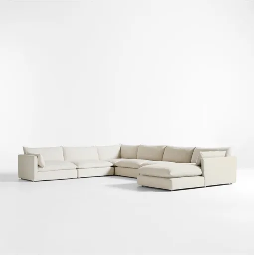 It's time to Unwind with our coastal-cool slipcovered sectional collection. Named after our favorite thing to do, this modern beauty delivers relaxing proportions and sumptuous sink-in cushions. The six-piece sectional—left-arm chair, three armless chairs, corner and right-arm chaise— features slim arms and low decks that make room for pillowy back and seat cushions for an exceptionally deep, comfortable sit. We love the natural feel and slubby texture of the slipcovers, made of a breezy blend of cotton, linen and viscose yarns.