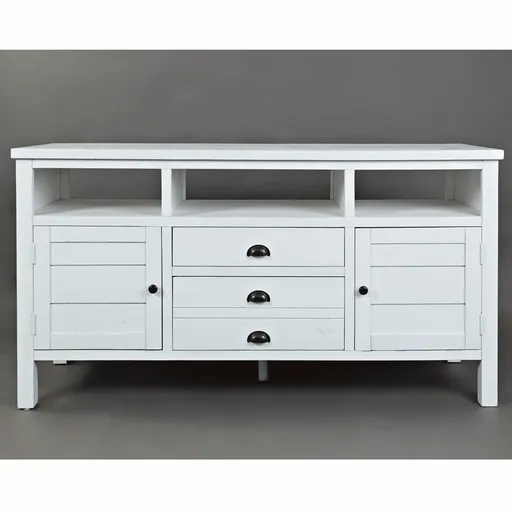 The Seaside Weathered White 60" Media Unit infuses a rich character to any room of your home! Crafted from solid hardwood and veneers, each piece has a uniquely distressed white finish for a one-of-a-kind look. The design includes a plank-style top and cabinet doors as well as straight legs for a beautifully rustic appearance. Three open shelves provide space for your media components, while three middle drawers and two cabinets with adjustable interior shelves offer additional storage room. This media unit is also available in 50" and 70" sizes plus Dakota Oak and Washed Grey finishes.
