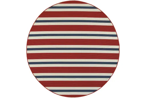 Bring a pop of color to your outdoor dining space with this 7'9" round rug in bold Cabana Stripes Red. Made from durable fiber material, this contemporary style rug is perfect for both indoor and outdoor use. This patio piece will elevate your outdoor space.