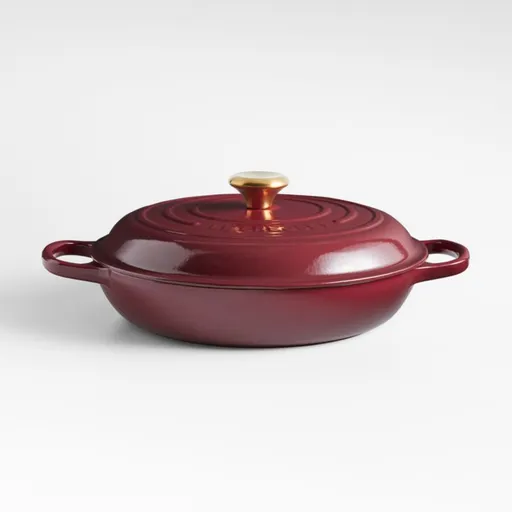 A luxurious new hue inspired by the lush region of the Côtes du Rhône in southern France. Enamel in rich wine red coats this everyday pan with a smooth, shock-resistant finish, making it impervious to acid, alkali, odors and stains. Crafted with a specially designed "all-round" lip for drip-free pouring with either hand, the pan is topped with a close-fitting lid that creates a blanket of heat for even cooking and superb braising. The lidded braiser is compatible with all types of heat sources, from gas and induction stoves to outdoor grills. Topped with a gleaming gold-finished knob, this display-worthy pan is perfect for stews, paella or shakshuka.