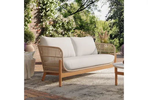 The Solara Modern Natural 70" Wood Outdoor Loveseat combines contemporary design with casual elegance, making it a perfect addition to any outdoor space. Crafted from durable acacia wood and featuring a unique rope frame, this loveseat offers both style and comfort. The weather-resistant polyester fabric ensures long-lasting beauty and functionality. This patio piece will elevate your outdoor space.
