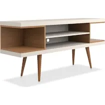 The Westin TV Stand melds quality craftsmanship, brilliant design, and modern functionality to create a seamlessly streamlined, and free-standing entertainment center. Statement legs and corner open storage sections bring character to a space.Three airy shelves are perfect for storing all your entertainment accessories.Media holes for wire management.Recommended for a 50" TV.