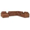 Includes 8 modular pieces: left-arm facing corner chaise, 2 audio consoles with storage, wedge, 3 armless chairs and right-arm facing corner chair "Left-arm" and "right-arm" describe the position of the arm when you face the piece Modular pieces can float anywhere; sides are finished (with no connectors) Corner-blocked frame; loose reversible seat and back cushions; high-quality foam cushions wrapped in poly fiber Throw pillows included; soft polyfill Polyester upholstery Next-Gen Nuvella™ is a family-friendly fabric that is soft, easy to clean, stain-resistant and durable; easy-to-remove zippered covers for machine washing Clean fabric with mild soap and water, let air dry; for stubborn stains, use a solution of 4 oz. bleach to 28 oz. water Non-skid legs Console with removable plexiglass top; pull-out drawer for storage; built-in audio sound system with wireless connectivity; audio controls located on console; USB charging Power cord included; UL Listed Platform foundation system resists sagging 3x better than spring system after 20,000 testing cycles by providing more even support Smooth platform foundation maintains tight, wrinkle-free look without dips or sags that can occur over time with sinuous spring foundations