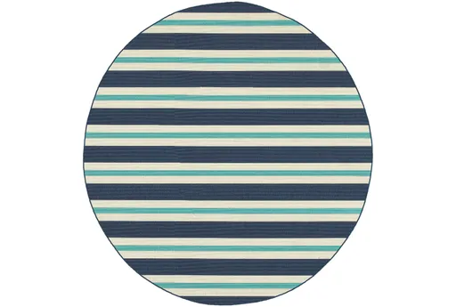 This stunning 7'9" round outdoor rug features a contemporary style with vibrant cabana stripes in blue, perfect for any dining room or outdoor space. Made with durable fiber material, this rug is designed to withstand the elements and provide long-lasting beauty. This patio piece will elevate your outdoor space.