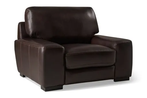 The Palmer Chair is contemporary and sleek with its rich brown leather upholstery and wide and low-rise arms A light-toned stitching pattern and an exceptionally tall back pillow make this chair a luxury spot with panache