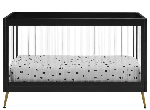 The Sloane 4-in-1 acrylic convertible crib by Delta Children is the clear choice for your baby's modern nursery! Its unique design features clear acrylic spindles that provide an open, airy feel while the splayed bronze feet add some polish to the clean lines. If that's not enough, it even converts from crib to a toddler bed, sofa and daybed, making this a versatile bed that grows with your child. This crib is JPMA certified, and is tested above and beyond industry standards.