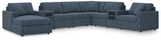 Includes 8 modular pieces: left-arm facing corner chaise, 2 audio consoles with storage, wedge, 3 armless chairs and right-arm facing corner chair "Left-arm" and "right-arm" describe the position of the arm when you face the piece Modular pieces can float anywhere; sides are finished (with no connectors) Corner-blocked frame; loose reversible seat and back cushions; high-quality foam cushions wrapped in poly fiber Throw pillows included; soft polyfill Polyester upholstery Next-Gen Nuvella™ is a family-friendly fabric that is soft, easy to clean, stain-resistant and durable; easy-to-remove zippered covers for machine washing Clean fabric with mild soap and water, let air dry; for stubborn stains, use a solution of 4 oz. bleach to 28 oz. water Non-skid legs Console with removable plexiglass top; pull-out drawer for storage; built-in audio sound system with wireless connectivity; audio controls located on console; USB charging Power cord included; UL Listed Platform foundation system resists sagging 3x better than spring system after 20,000 testing cycles by providing more even support Smooth platform foundation maintains tight, wrinkle-free look without dips or sags that can occur over time with sinuous spring foundations