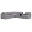 Includes 6 modular pieces: left-arm facing corner chair, audio console with storage, wedge and 3 armless chairs "Left-arm" and "right-arm" describe the position of the arm when you face the piece Modular pieces can float anywhere; sides are finished (with no connectors) Corner-blocked frame; loose reversible seat and back cushions; high-quality foam cushions wrapped in poly fiber Throw pillows included; soft polyfill Polyester upholstery Next-Gen Nuvella™ is a family-friendly fabric that is soft, easy to clean, stain-resistant and durable; easy-to-remove zippered covers for machine washing Clean fabric with mild soap and water, let air dry; for stubborn stains, use a solution of 4 oz. bleach to 28 oz. water Non-skid legs Console with removable plexiglass top; pull-out drawer for storage; built-in audio sound system with wireless connectivity; audio controls located on console; USB charging Power cord included; UL Listed Platform foundation system resists sagging 3x better than spring system after 20,000 testing cycles by providing more even support Smooth platform foundation maintains tight, wrinkle-free look without dips or sags that can occur over time with sinuous spring foundations