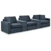 Includes 5 modular pieces: left-arm facing corner chair, armless chair, 2 consoles with storage and right-arm facing corner chair "Left-arm" and "right-arm" describe the position of the arm when you face the piece Modular pieces can float anywhere; sides are finished (with no connectors) Corner-blocked frame Loose reversible seat and back cushions; high-quality foam cushions wrapped in poly fiber Throw pillows included; soft polyfill Polyester upholstery Next-Gen Nuvella™ is a solution-dyed performance fabric that offers high UV resistance and durability for high-traffic areas; some Next-Gen Nuvella slipcovers may be removable for machine washing and drying Clean fabric with mild soap and water, let air dry; for stubborn stains, use a solution of 4 oz. bleach to 28 oz. water Non-skid legs Console with removable plexiglass top; pull-out drawer for storage Platform foundation system resists sagging 3x better than spring system after 20,000 testing cycles by providing more even support Smooth platform foundation maintains tight, wrinkle-free look without dips or sags that can occur over time with sinuous spring foundations