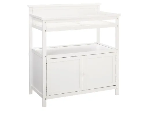 Simplify diaper changes with the functional and stylish Elotis Changing Station, offered in a white finish to complement any nursery. Built from solid hardwood, this station features ample storage with one shelf and two doors to keep essentials organized. A standard changing pad is included, fitting perfectly into the tray for added convenience.