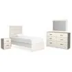 Includes twin panel bed (headboard, footboard and rails), 2-drawer nightstand and 6-drawer dresser with mirror Made of engineered wood (MDF/particleboard/plywood) and decorative laminate White finish with subtle replicated wood grain Decorative laminate replicates natural or man-made material surfaces with consistent color, pattern and texture Antiqued pewter-tone handles Smooth-gliding drawers Mirror attaches to back of dresser Mattress and foundation/box spring available, sold separately Bed is compatible with an adjustable base Safety is a top priority, clothing storage units are designed to meet the most current standard for stability, ASTM F 2057 (ASTM International) Drawers extend out to accommodate maximum access to drawer interior while maintaining safety Assembly required