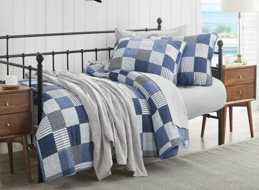 Going back to quilt traditions, this Nautica holly grove faux patchwork is introduced in livable shades of blue combined with crisp white. Consisting of ticking stripes, buffalo checks, and line work, the quilt is truly reversible featuring a light blue printed texture on the reverse. The rounded corner shams provide a soft sensibility that features the reverse print into the binded edges. For easy removal, shams have a 2 piece back closure. We have you "covered" literally with this 100% cotton set including a quilt and 2 shams (1 sham for twin size) that is both lightweight and breathable. Perfect for year round use with our cotton/polyester blend fill. A 3 inch box stitch enhances loftiness of the quilt and ensures filling to not shift in between washes. Offering a cool, causal style that is prewashed for added softness. All sets are easy care and machine washable. sustainably crafted, our eco-friendly packaging is a way to help reduce plastic waste. This set is securely bundled with a four way ribbon.