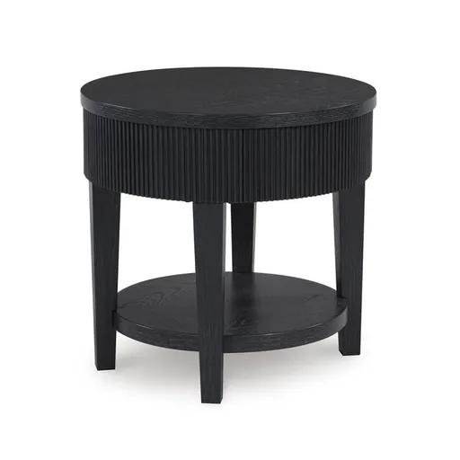 Classic and cool in dark charcoal, this end table brings contemporary convenience to your living room. Short on storage? The trendy reeded apron conceals a drawer perfect for remotes, controllers and other entertainment accessories. What a perfect marriage of style and functionality.