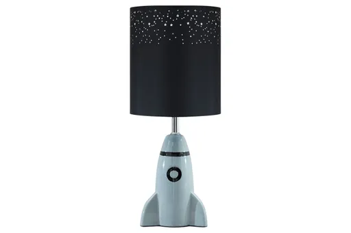 This adorable bedside lamp is perfect if you’re looking for out-of-this-world style! The Cale Spaceship Lamp is detailed with star-shaped cutouts to allow light to shine bright through the cylindrical drum shade. A stellar choice! Product Details: • Made of ceramic with metal • Fabric drum shade with star cutouts • On-off switch • 1 tyle A bulb (not included) 60 watts max or CFL 13 watts max • Clean with a soft, dry cloth • Assembly required Dimensions: • 8”W x 8”D x 18.75”H