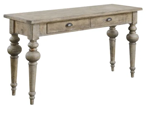 The Interlude sofa table from Emerald Home brings charming sophistication to your space. This rustic-casual style table features hand-distressed woods with wrought iron-inspired hardware. Its distinct leg design and storage drawers give a beautiful update to the classic design.